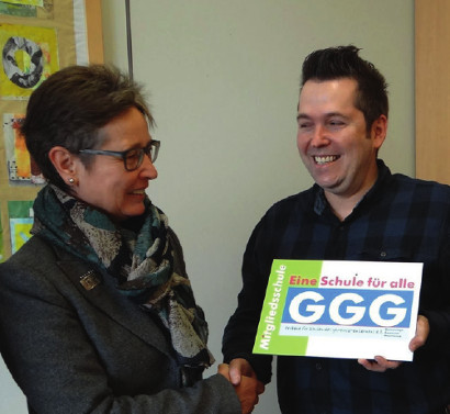 Der Landesverband Bayern freut sich und ist stolz, dass 100 % der bayrischen Gesamtschulen in der GGG aktiv sind. Als sichtbares Zeichen der Zugehörigkeit erhielt nun auch die staatliche Gesamtschule Hollfeld unter der Leitung von Frau Christiana Scharfenberg als korporatives Mitglied das neu gestaltete Schild „GGG Mitgliedsschule – Eine Schule für alle“.