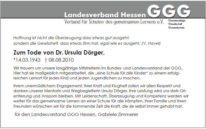 Ursula Dörger ist tot. Sie hat am Ende den Kampf gegen den Krebs verloren. Bis ganz zum Schluss, bis es nicht mehr ging, hat sie in Telefonkonferenzen, Mails und Korrespondenzen an unserem großen, gemeinsamen Ziel gearbeitet: