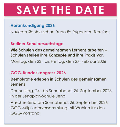 Im Juli dieses Jahres ist eine vom Forschungsinstitut für Bildungs- und Sozialökonomie (FiBS) im Auftrag von Bündnis 90/Die Grünen herausgegebene Potenzialstudie zum Ausbau von Gemeinschaftsschulen in Berlin erschienen. Darin befindet sich die Handlungsempfehlung, die Öffentlichkeitsarbeit für die Gemeinschaftsschulen zu stärken. Ich denke, dass dieses Magazin einen Beitrag dazu leisten kann. Unabhängig von ihrer GGG-Mitgliedschaft erhalten es alle Berliner Schulen, die schulpraktischen Seminare sowie die Schulaufsichtsstellen. Besonderer Dank gebührt in dieser Hinsicht dem Berliner Grundschulverband, der es ermöglicht, dass auch alle Berliner Grundschulen mit dem Magazin versorgt werden können.
